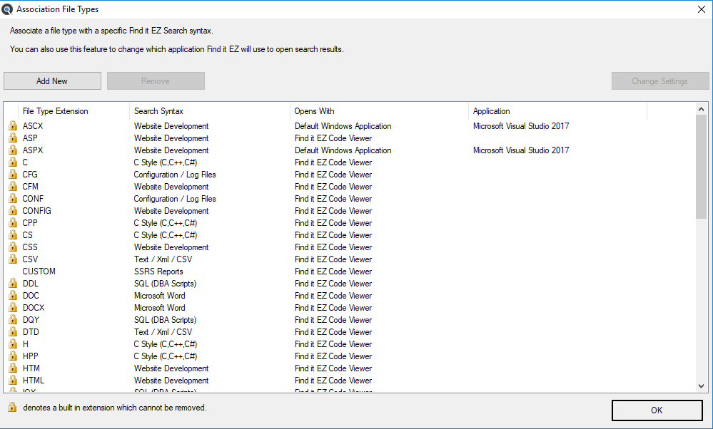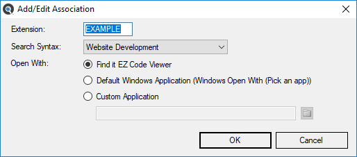 You may add custom file type extensions to be searched using the menu, which will launch the Associate File Types dialog as below: