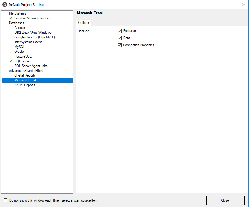 Note that when the Microsoft Excel source is selected, you are able to select from the following Search options to optimize search performance and reduce false-positive matches: