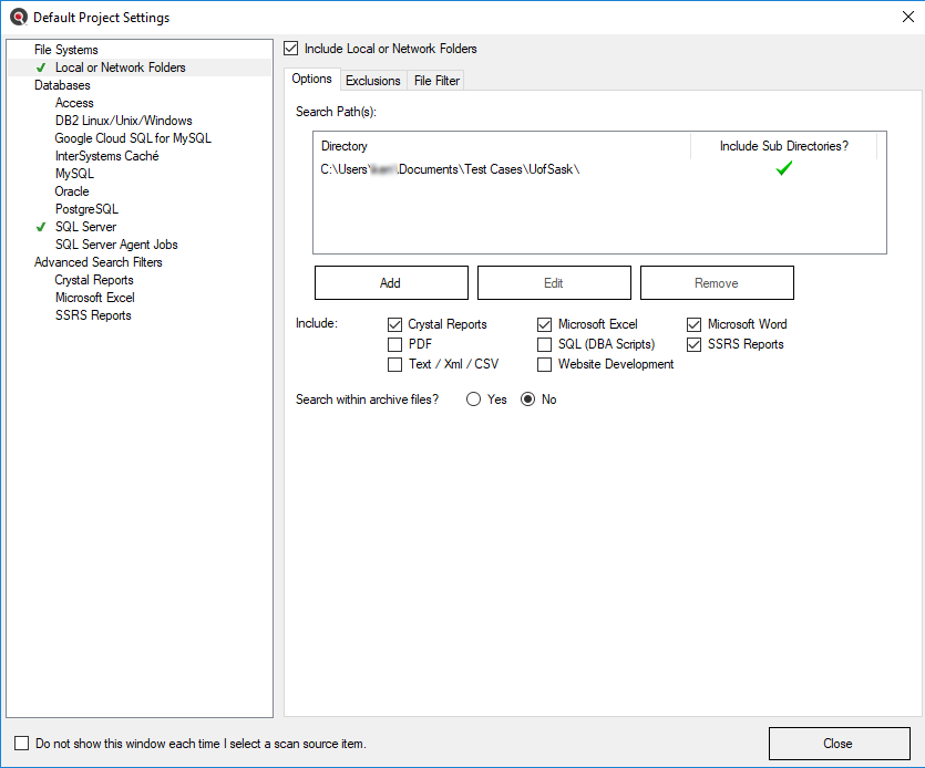 This section describes the procedures required to include the documents source in a project, add or remove file extensions searched, open results with the desired viewer / editor, and select Microsoft Excel search scope options (where applicable).