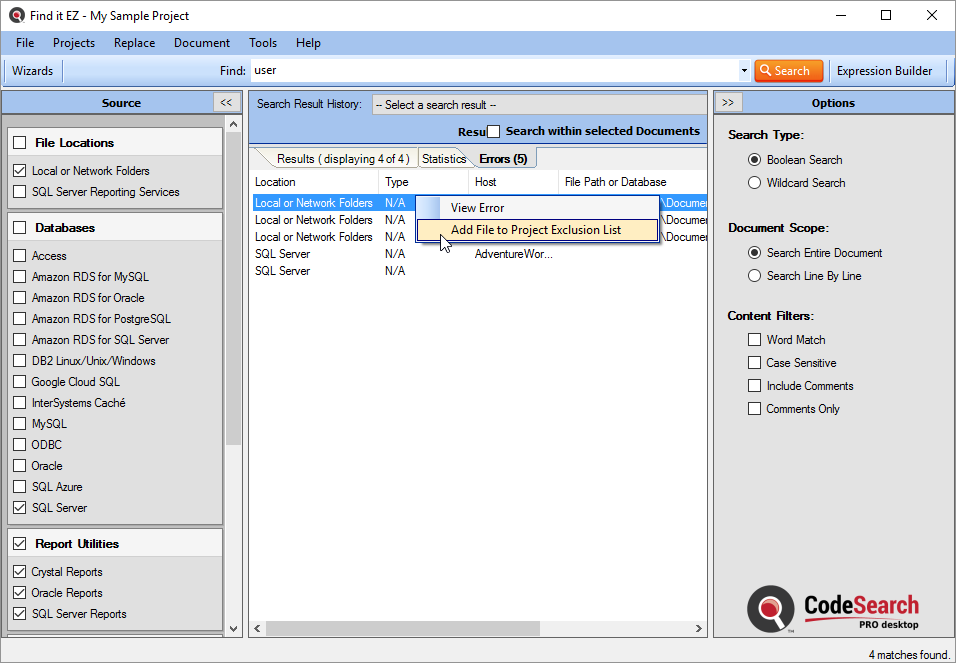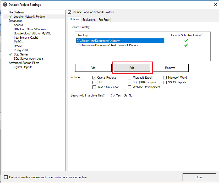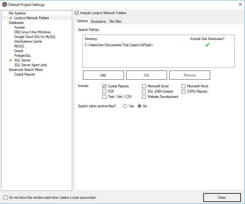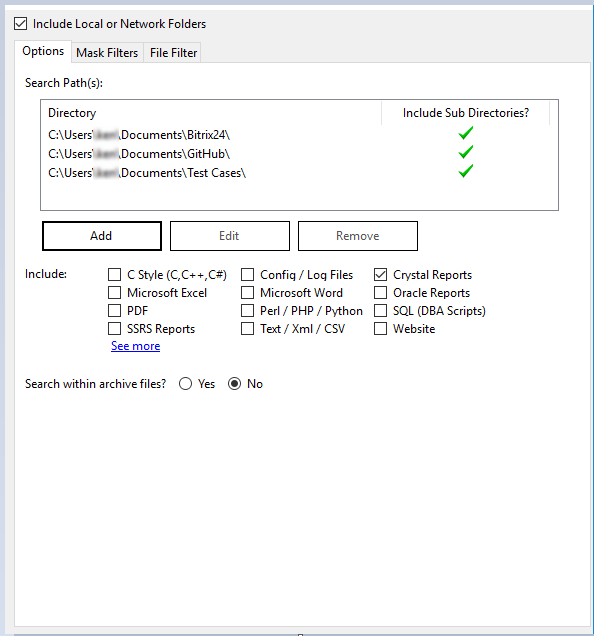 This section describes the procedures required to include the set of selected programming files, reports, and other documents from local or network folders, add or edit search path(s), include / exclude archive files, exclude files or folders, and to apply file filters to restrict processing to only a subset of selected files.