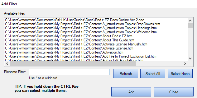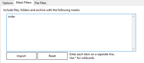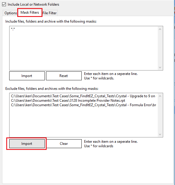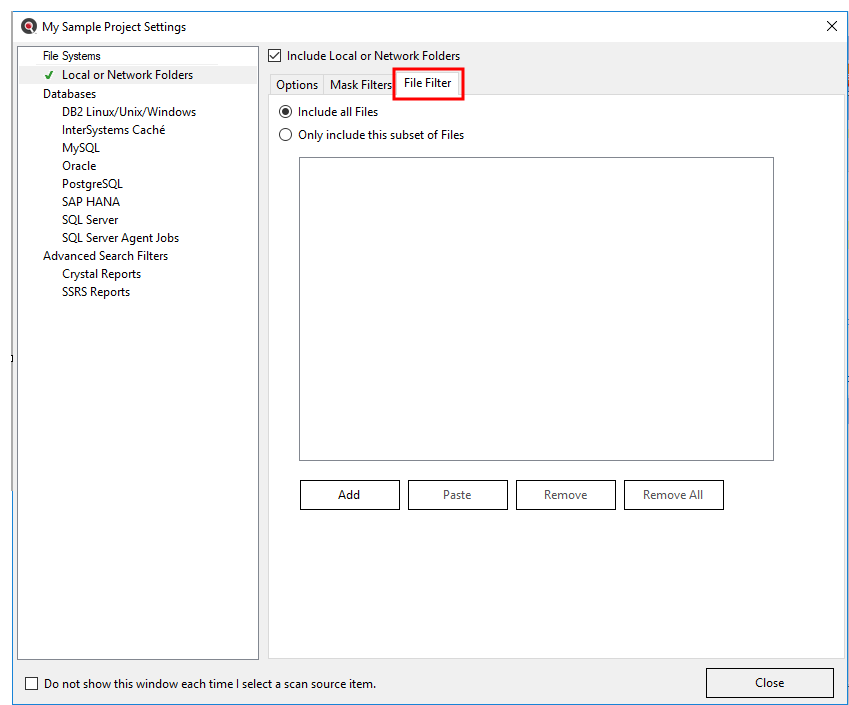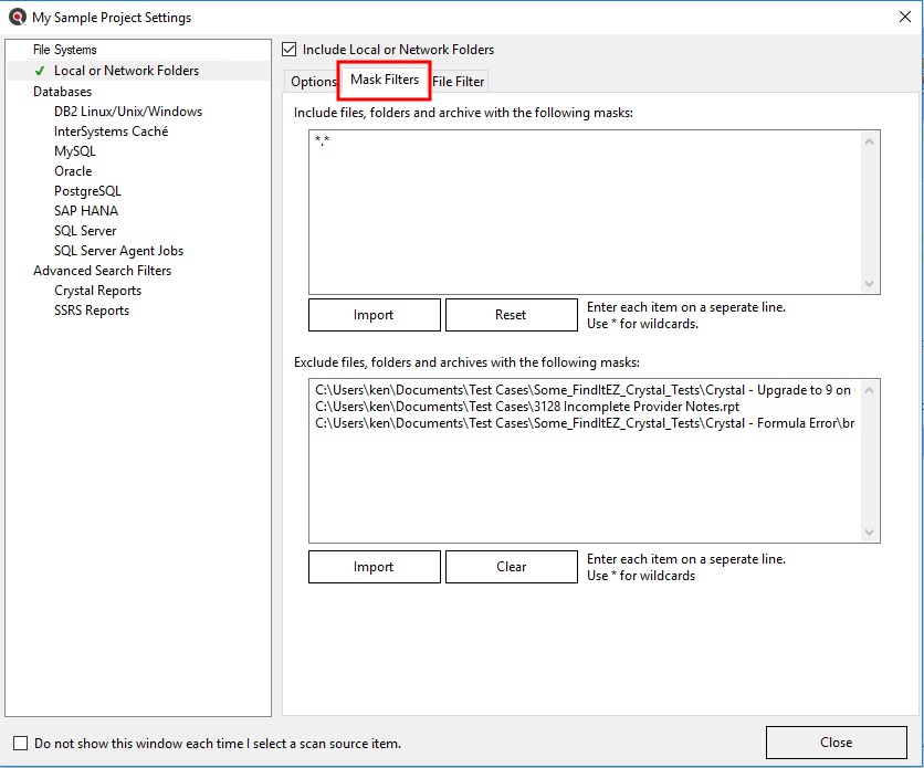 You may use both the Mask Filters and/or the File Filter tabs to include only a subset of specific files within the configured path(s). You must first add the desired source path folders. This filter is often used to minimize false positives or expedite indexing and searching by limiting the number of file contents included in a project. This setting can be quickly changed to include all or a subset of files as needed.