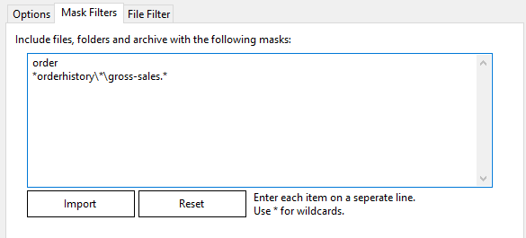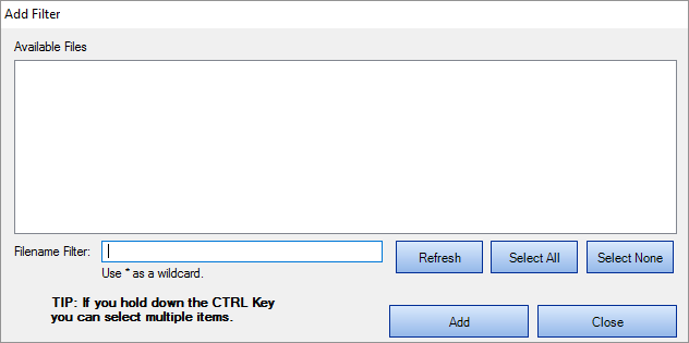 The Available Files list will be populated with a list of files included in the folders selected previously on the Options tab, and filtered to include / exclude specific subsets of files based on any entries on the Mask Filters tab.