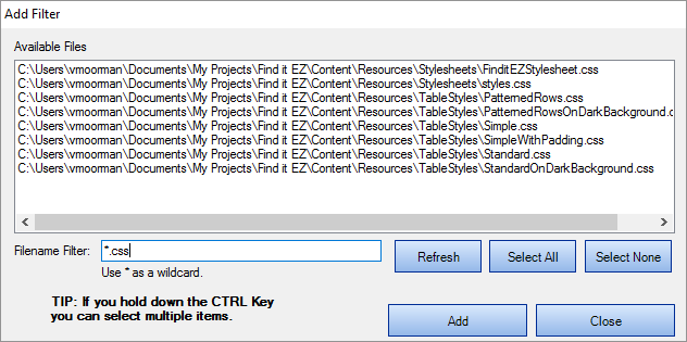 Enter the desired file name filter, using wildcards as desired (e.g. *.cs, *.js, *user*, etc.).