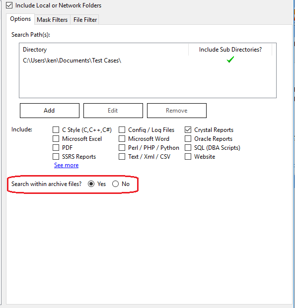 To include archive files in your Local or Network Folders search, locate and click the Yes option to Search within archive files.