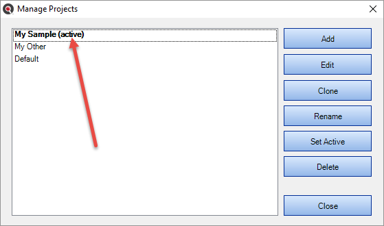Click on the button. The project will appear in the list followed by the word "(active)."